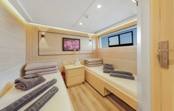 Life Rafts with Ladder | 1 x 25 person, 2 x 20 person, annual maintenance First Aid Kit, Oxygen Kit | YES Life Jackets | 45 Life Buoys | YES Fire Fighting Equipment | YES Fire Alarms | YES Sprinkle fire extinguisher for the Kitchen (Foam) & Engine room | YES ENOS System | YES Marine Signals & Flares | YES Rescue rope launching gun | YES Radar + Echo Sounder | YES VHF Radio | YES HF Radio | YES EPIRB - AIS - SART | YES GPS | YES Compass | YES CCTV Camera system | YES Escape Hatches | YES Spare Bilge Pump | YES Rescue Boats in the North (SOS Boats) | YES Contract with the hyperbaric chamber & a local hospital | YES Emergency evacuation plan – is hanging on each dive deck | YES Captain & one crew member, MFA Certified & Trained | YES Oxygen tanks | YES Magnifier Glasses | YES Walkie Talkie radios between mother ship and the 2 speed boats | YES AED | YES Satellite phone | YES
