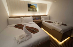 Your journey on White Manta Explorer is based on a lower deck cabin on a full board basis (3 meals/day onboard, tea, coffee, fruit, snacks)